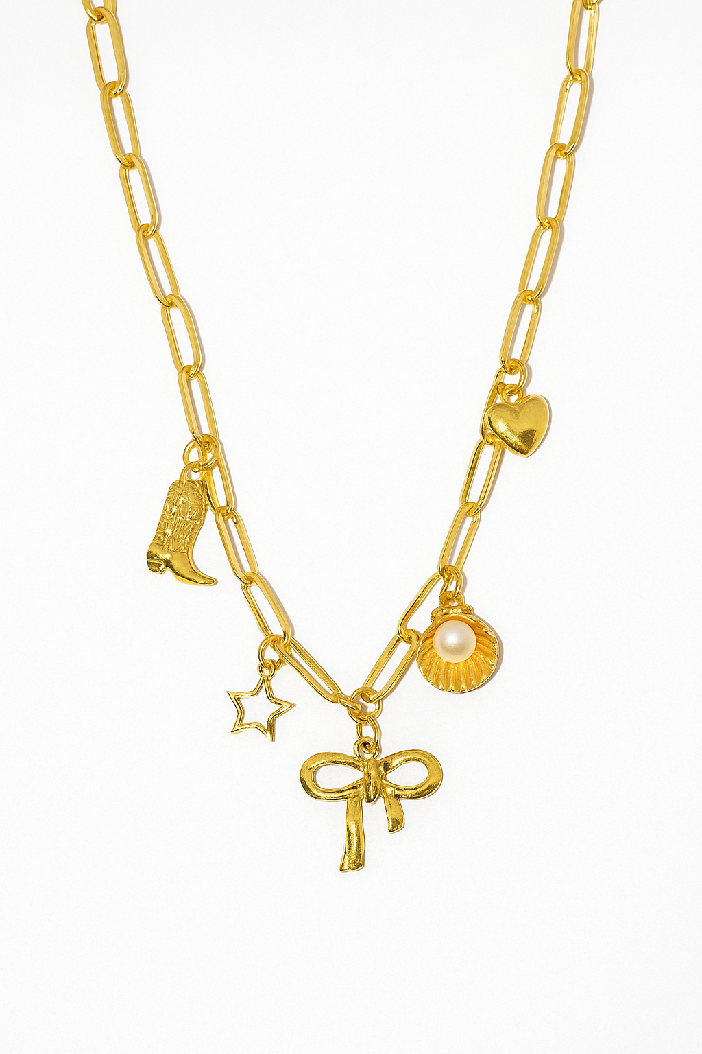 Introducing the Novelty Charm Necklace - your go-to statement piece that effortlessly elevates any look. This stunning gold necklace features unique novelty charms that add personality and sparkle to your style, making it the perfect conversation starter.