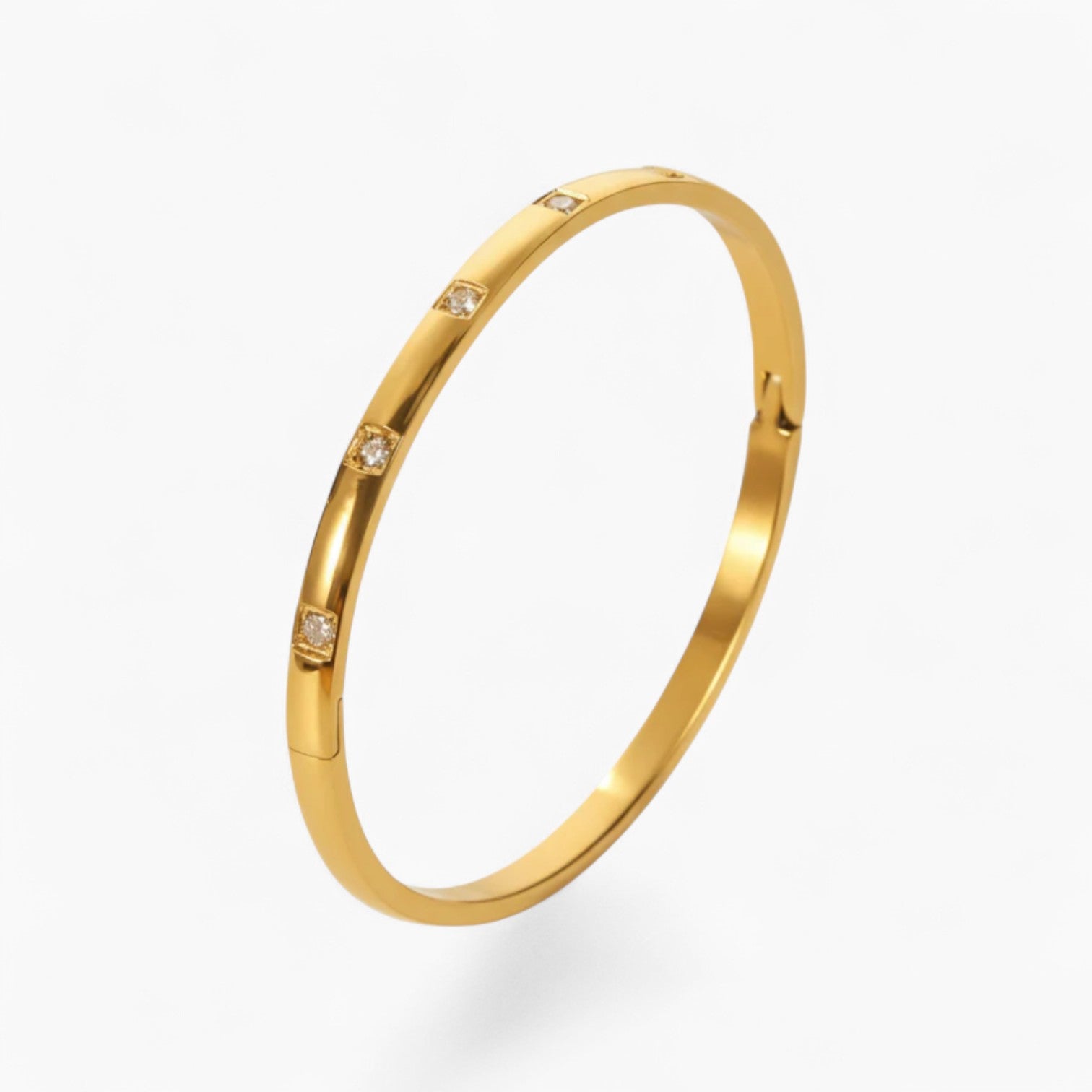 Discover understated luxury with the Winnie Bangle – a timeless piece that effortlessly combines classic elegance with modern sophistication. This stunning gold bangle features a sleek, polished band adorned with four evenly-spaced diamond accents that catch the light beautifully with every movement.
