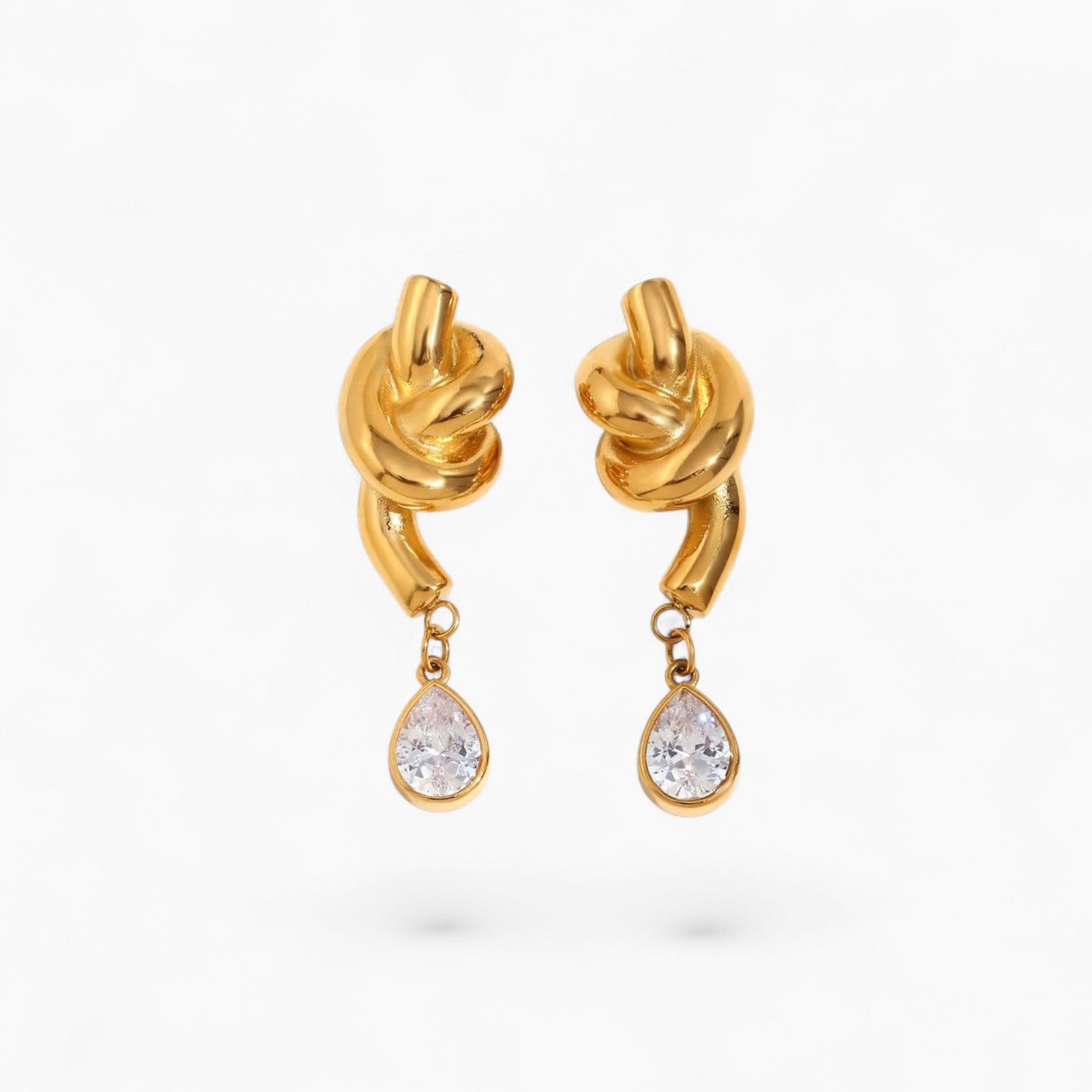 A sophisticated pair that beautifully combines sculptural design with sparkling luxury. These stunning earrings feature a polished gold twisted knot design at the top, flowing into delicate chain connectors that suspend brilliant teardrop-shaped crystals.