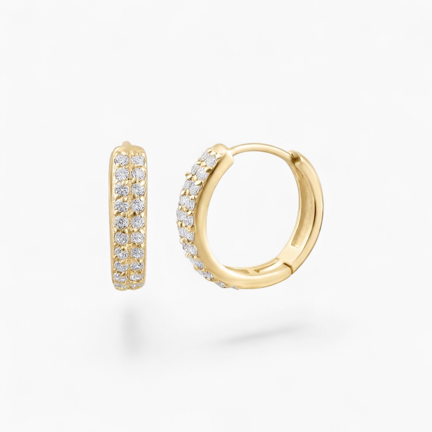 Effortless glamour meets everyday elegance. The Camilla Hoops are your go-to for instant sparkle—featuring two rows of brilliant cubic zirconia stones that catch the light from every angle, all set in lustrous 14k gold plating over 925 sterling silver.