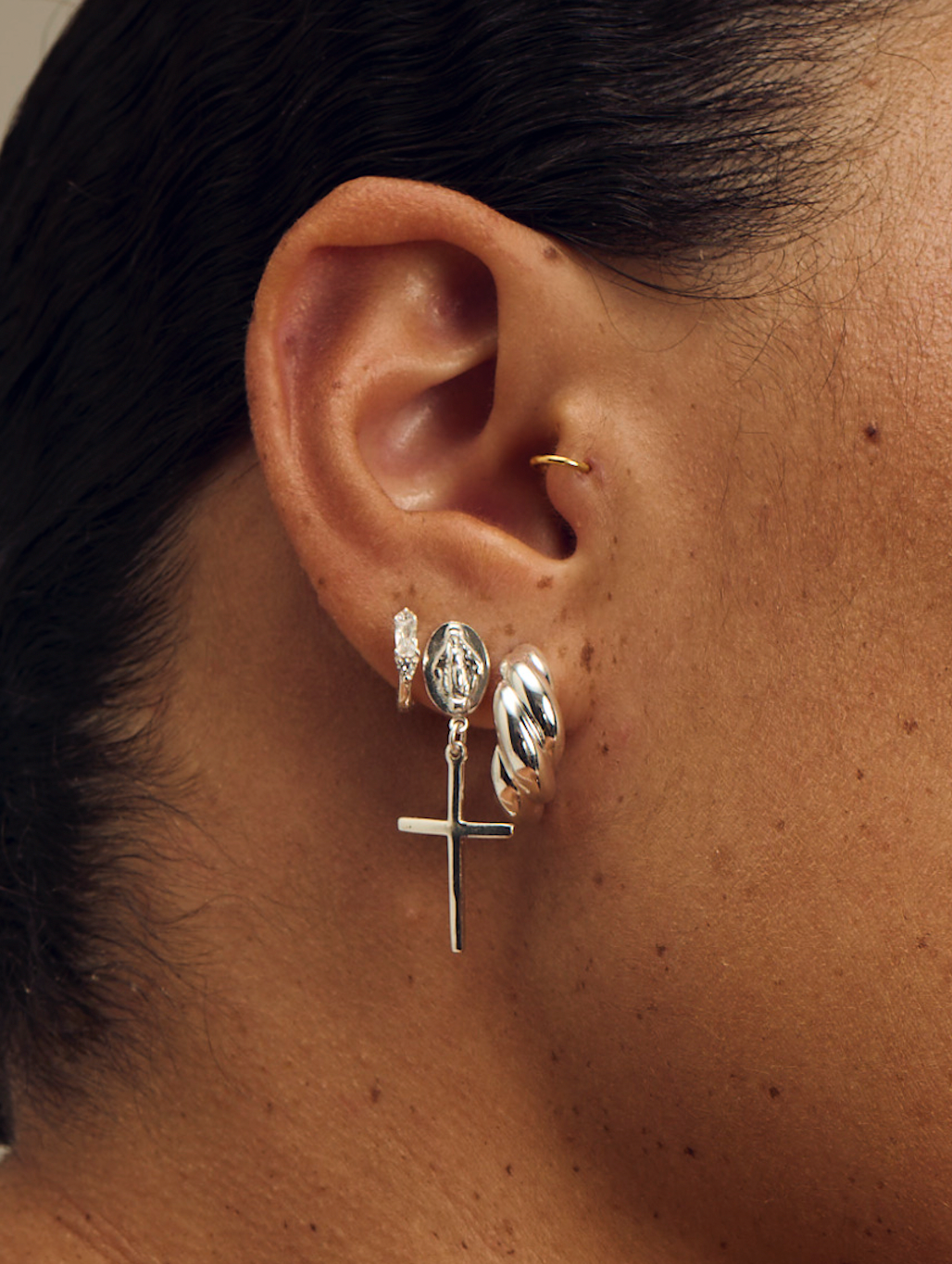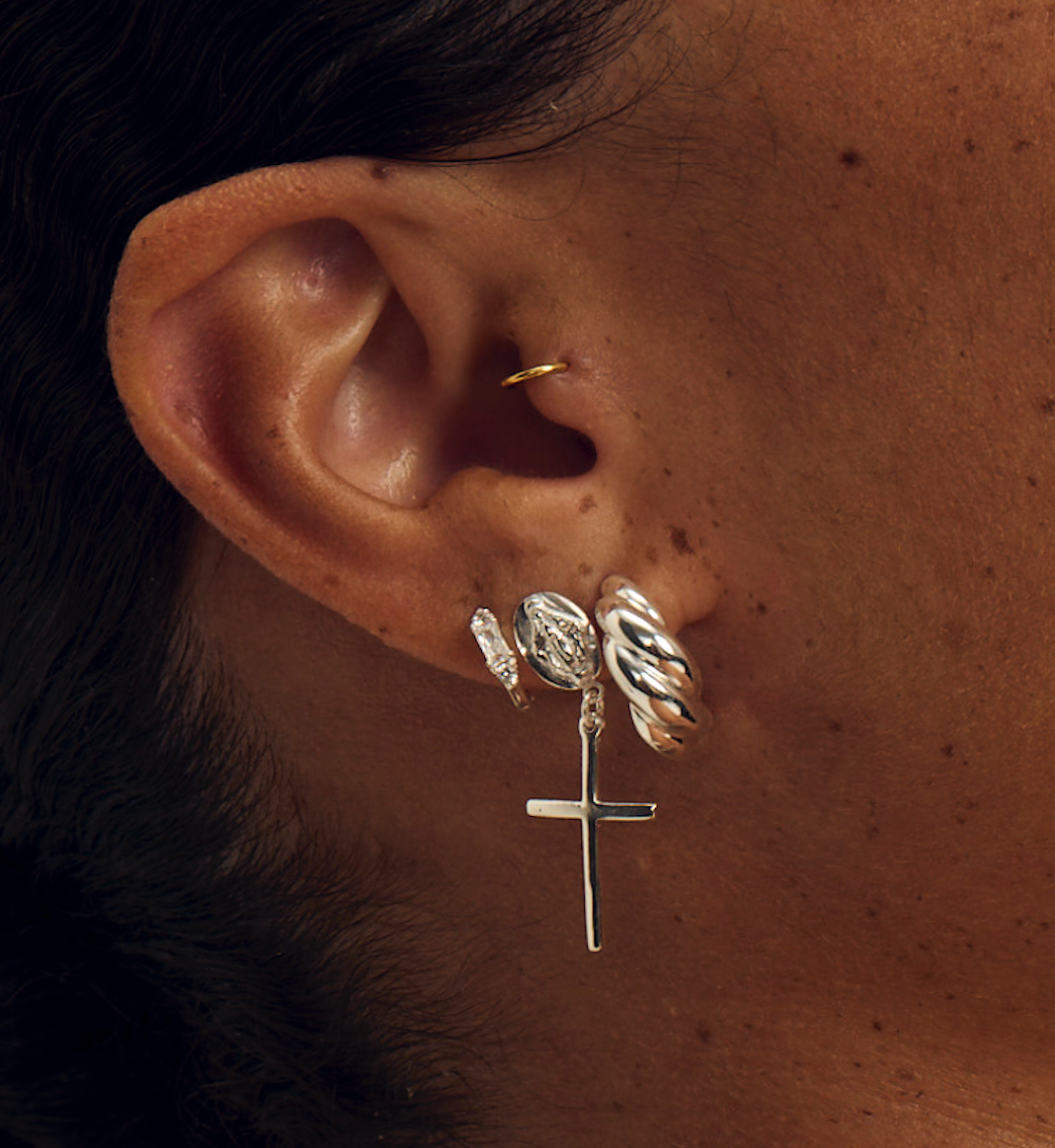 A dainty sparkle with major impact. The Tia Huggies feature a trio of baguette and round-cut cubic zirconia stones set into a 14k gold plated hoop. Designed to sit close to the lobe, they bring refined shine to any look — perfect for stacking or a subtle solo moment.