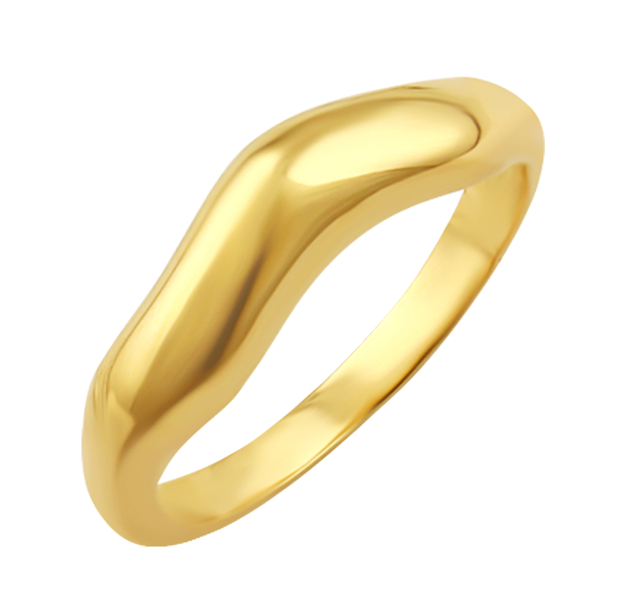Organic form, elevated finish. The Sage Ring is a fluid, wave-inspired band crafted in 14k gold plating for a sculptural, high-shine look. Its smooth, curved silhouette makes it the perfect piece for stacking or wearing solo with quiet confidence.
