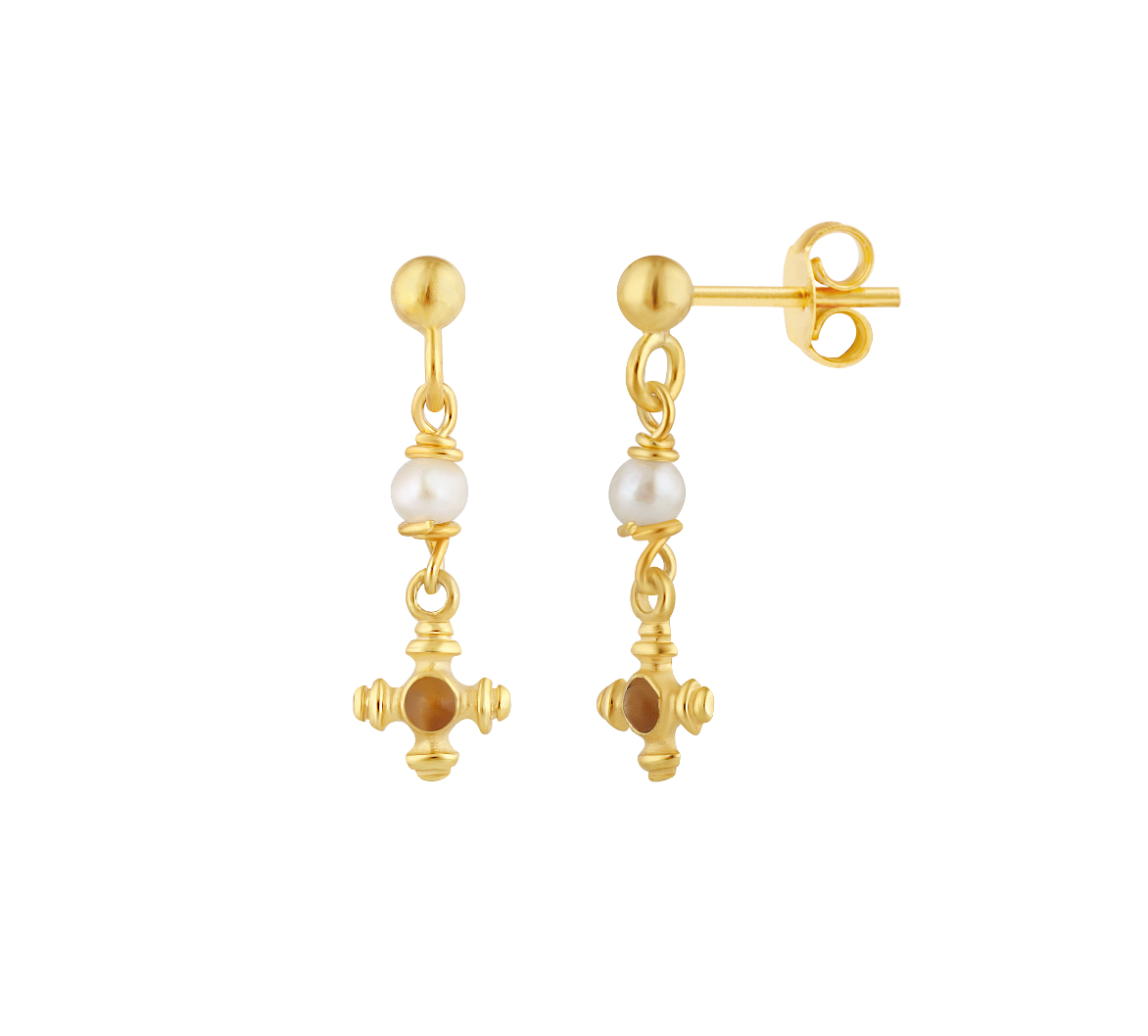 Make a bold statement with these 14k gold-plated cross drop earrings, expertly crafted with recycled sterling silver for a luxurious yet sustainable design. Featuring intricate textures, a luminous pearl accent, and a striking center detail, these earrings embody elegance with a touch of drama.