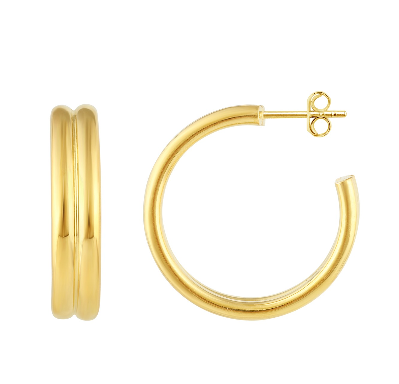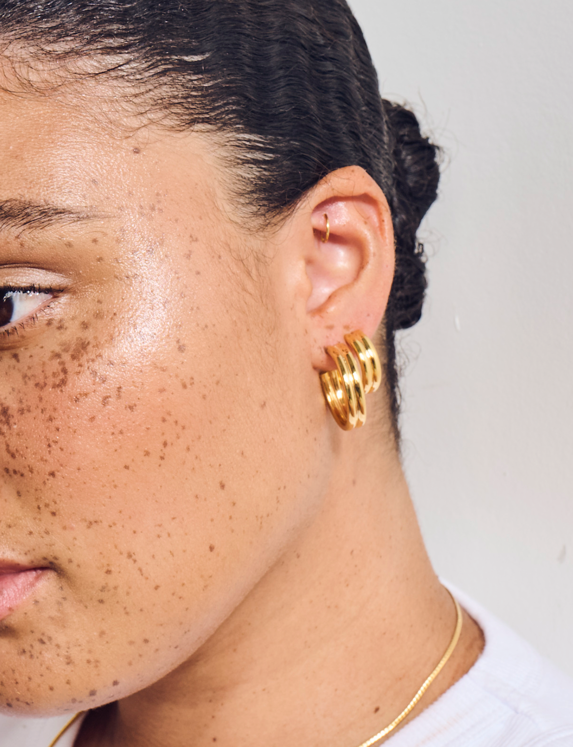 Elevate your everyday look with our HVAR HOOPS in gold. Made from 100% recycled sterling silver and plated in 14k gold, these staple pieces won't tarnish. Complete the set with our matching HVAR ring for a sophisticated and sustainable style.