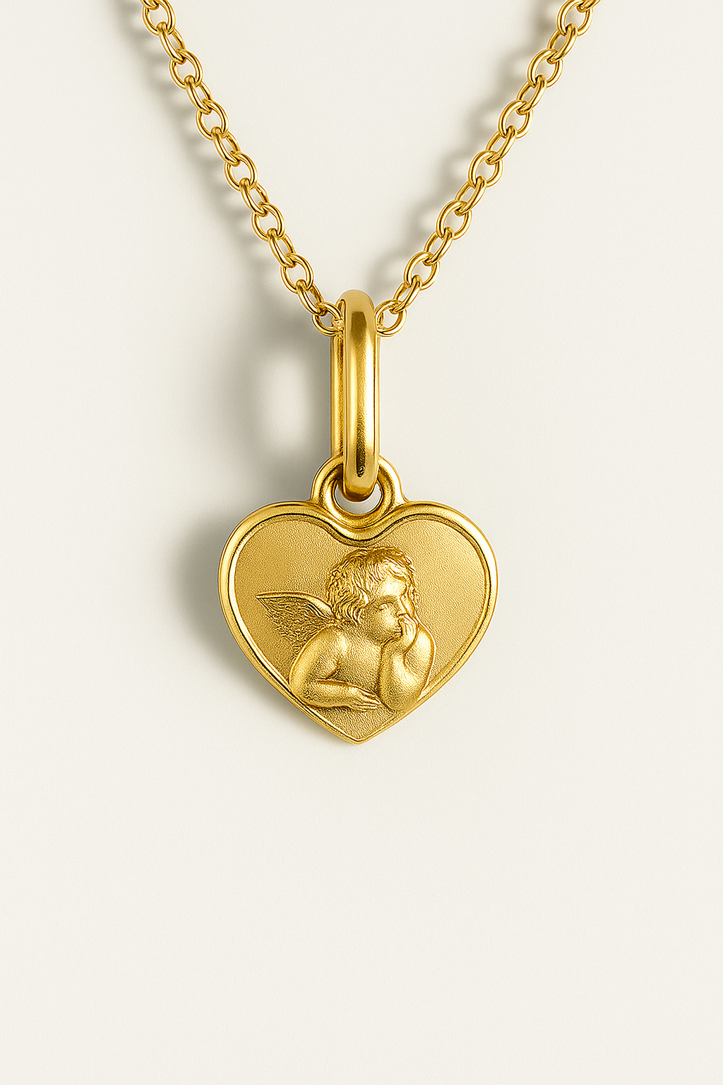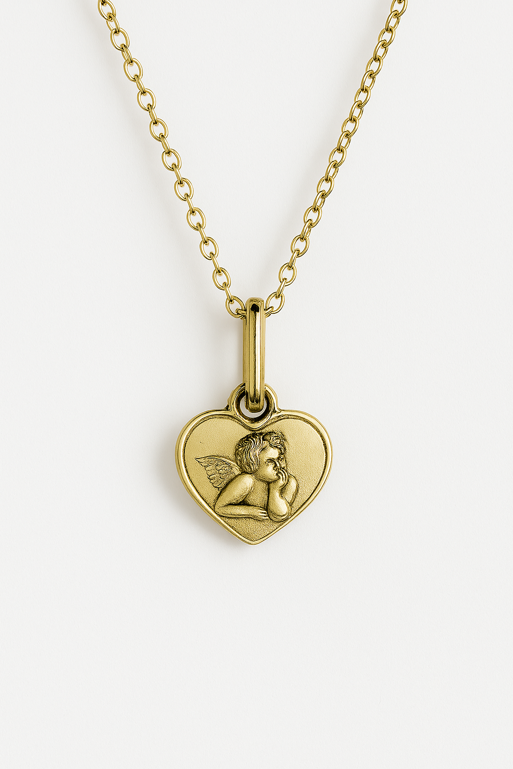 A love note in charm form. The Eze Necklace features a heart-shaped pendant engraved with a delicate cherub, hanging from a fine gold-toned chain. Crafted from zinc alloy, it’s lightweight, romantic, and perfect for layering or wearing solo as a soft statement.
