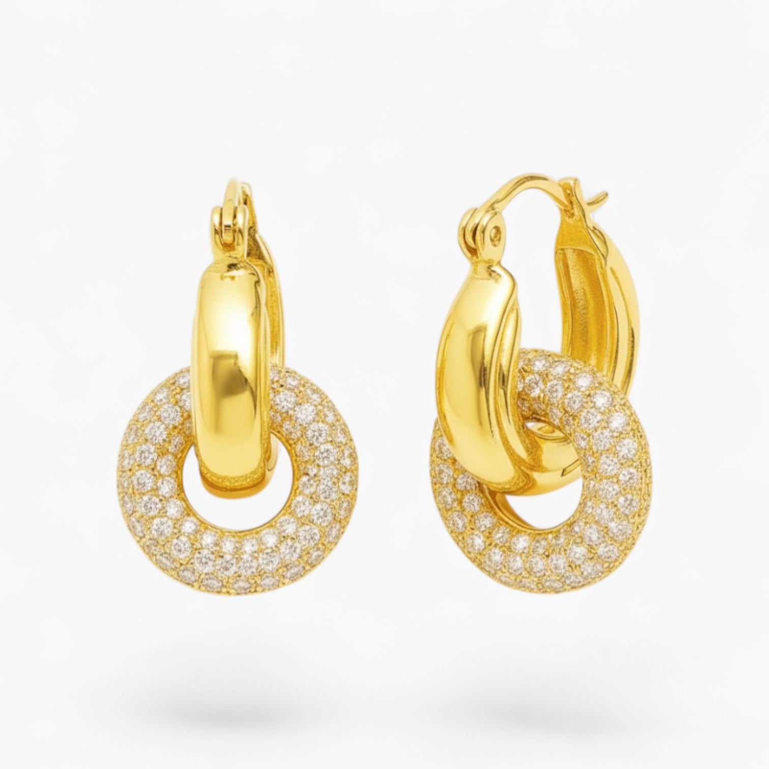 Designed with a sleek hoop and a pavé-set circular drop, these earrings strike the perfect balance between statement and sophistication. The soft sparkle adds dimension without feeling overdone, making them just as easy to wear day-to-day as they are for nights out.