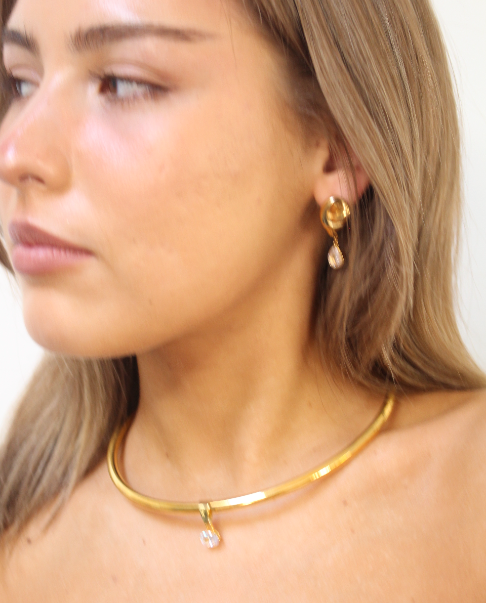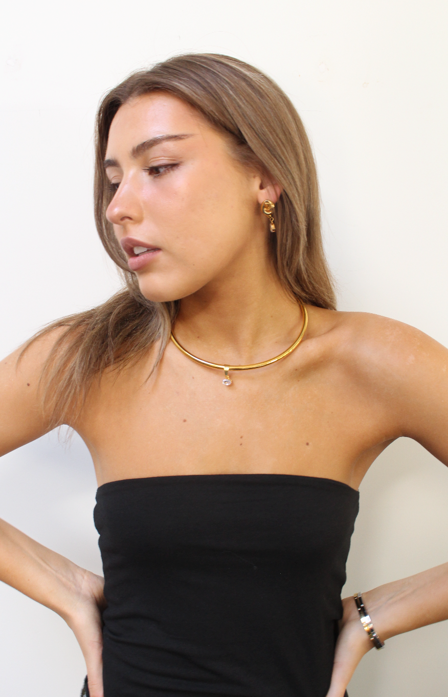 The Quinn Necklace is the kind of piece that doesn’t just frame your neckline — it defines it. With its sleek, sculptural gold collar and a single sparkling crystal charm, it strikes the perfect balance between minimalist design and quiet luxury.