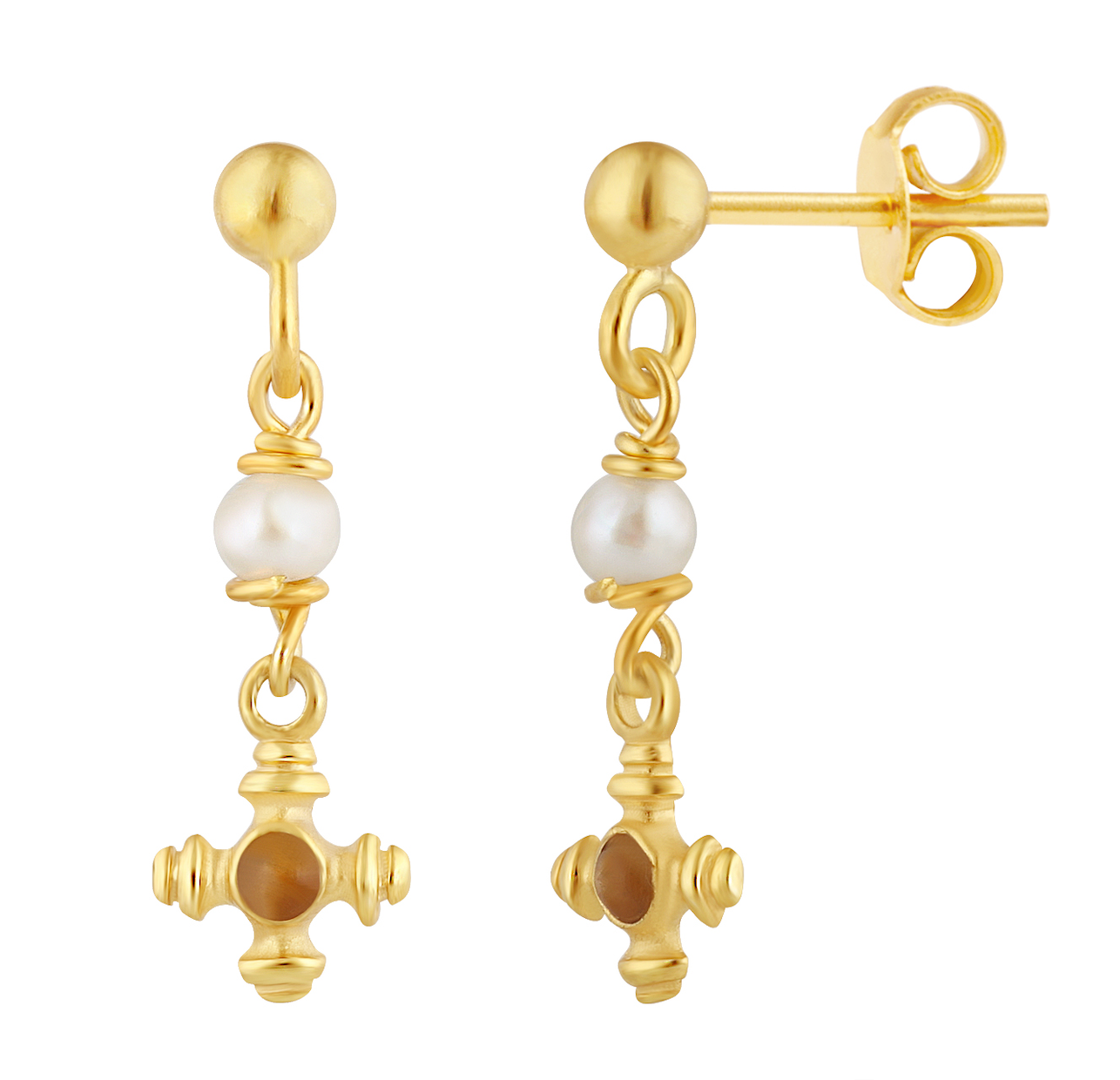 Make a bold statement with these 14k gold-plated cross drop earrings, expertly crafted with recycled sterling silver for a luxurious yet sustainable design. Featuring intricate textures, a luminous pearl accent, and a striking center detail, these earrings embody elegance with a touch of drama.
